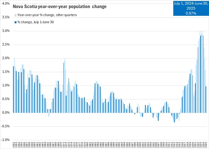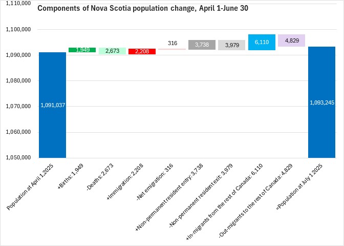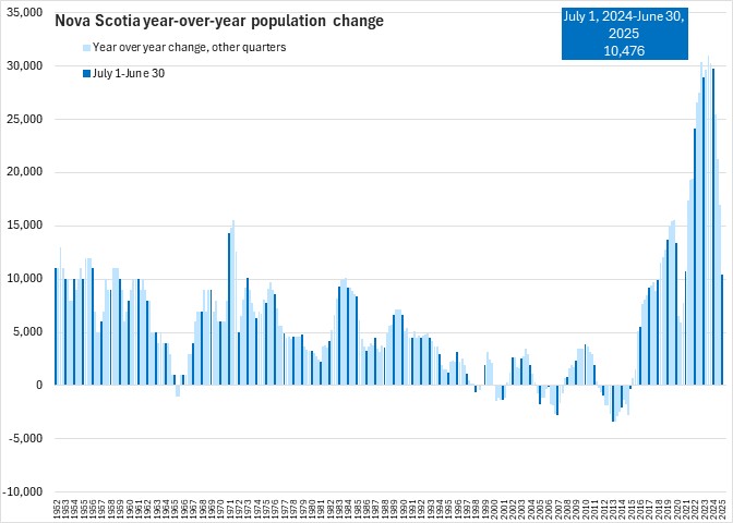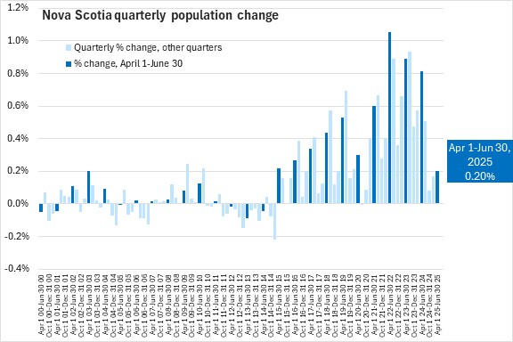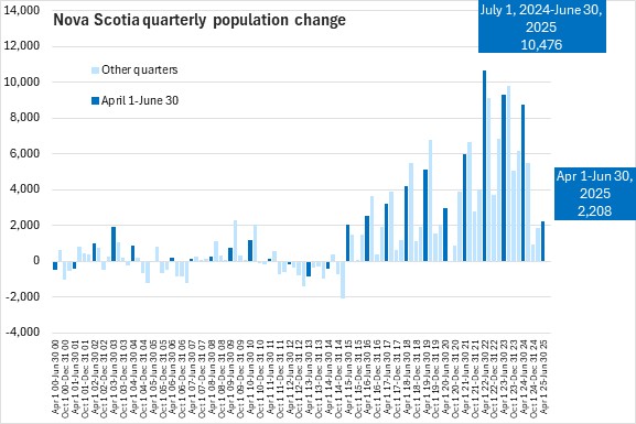 Nova Scotia's population growth of 2,208 (+0.20%) from April 1 to June 30, 2025 was slower than in the same period in the previous nine years. In the last year (July 1, 2024 to June 30, 2025), Nova Scotia's population has grown by 10,476.