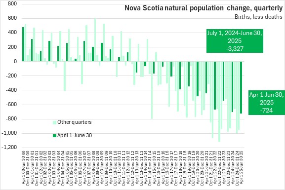 Nova Scotia’s natural population change (the number of births less the number of deaths) has been negative in every quarter since 2016. Between April 1 and June 30, 2025 there were 1,949 births and 2,673 deaths, amounting to a natural population decline of 724. The decline in the April-June period 2025 was of similar magnitude to same periods in 2022, 2023 and 2024.