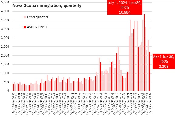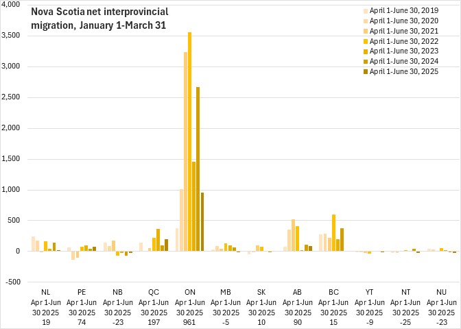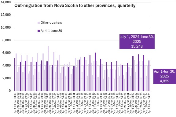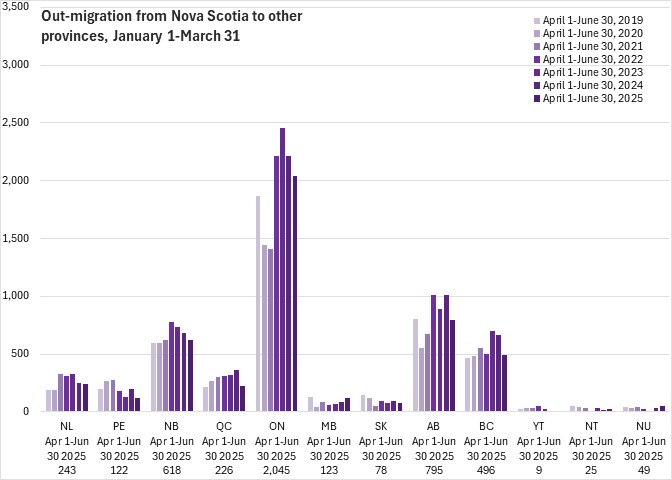 A total of 4,829 Nova Scotians left the province bound for other parts of Canada between April 1 and June 30, 2025 - a pace that has slowed since the same periods in 2022, 2023 and 2024. Over the past year (July 1, 2024 to June 30, 2025), Nova Scotia has seen 15,243 interprovincial outmigrants.