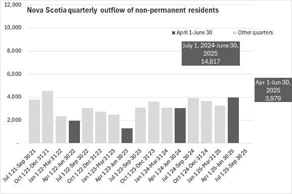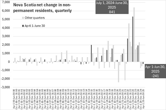 The net change in non-permanent residents in the province was 241 persons leaving Nova Scotia's population between April 1 and June 30, 2025. The number of non-permanent residents arriving in Nova Scotia was 3,738 while 3,979 non-permanent residents left the province over the same time.