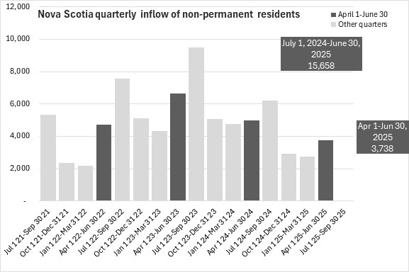 In the period July 1, 2024 to June 30, 2025 there was a net increase of 841 non-permanent residents in Nova Scotia with 15,658 non-permanent resident entries and 14,817 non-permanent resident exits.