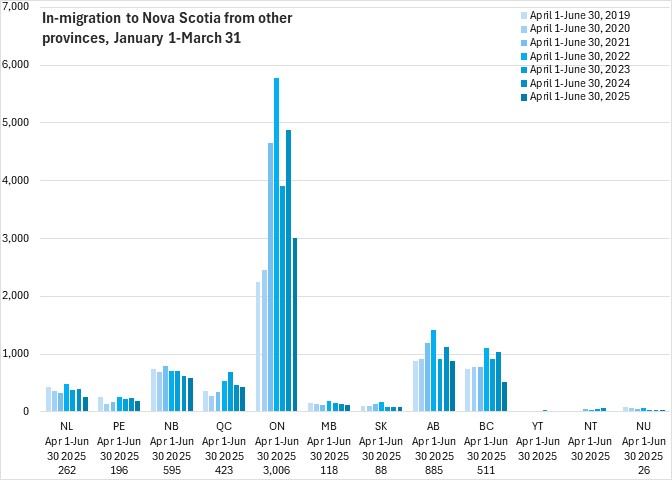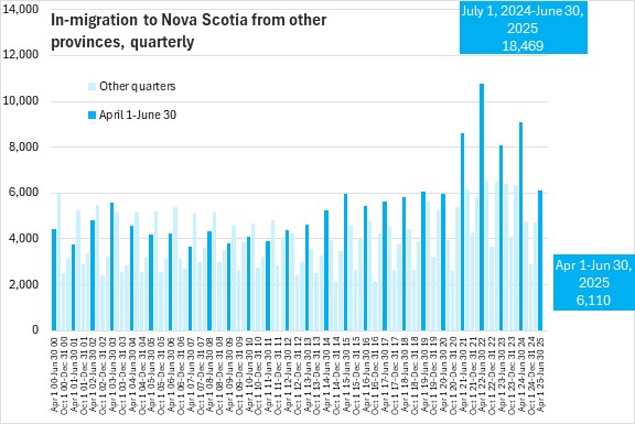A total of 6,110 new Nova Scotians arrived in the province from other parts of Canada between April 1 to June 30, 2025. This was the slowest pace of in-migration for the same period since 2020. From July 1, 2024 to June 30, 2025, 18,469 interprovincial migrants arrived in Nova Scotia.