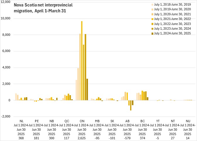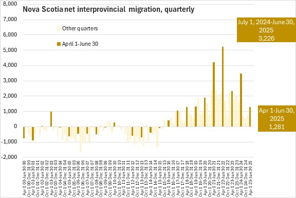 From April 1 to June 30, 2025 Nova Scotia's net interprovincial migration generated a net inflow of +1,281. From July 1, 2024 to June 30, 2025, Nova Scotia's net interprovincial migration was positive (+3,226). With slowing in-migration, Nova Scotia's net interprovincial migration flows have decelerated in the last two years.