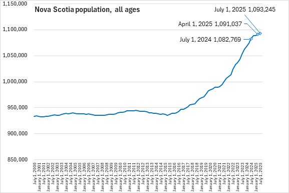Nova Scotia's population was 1,093,245 as of July 1, 2025, an increase of 2,208 (+0.20%) from April 1, 2025.