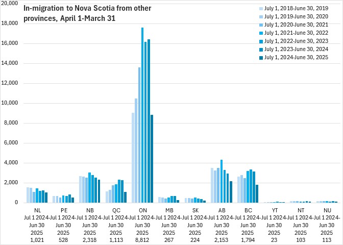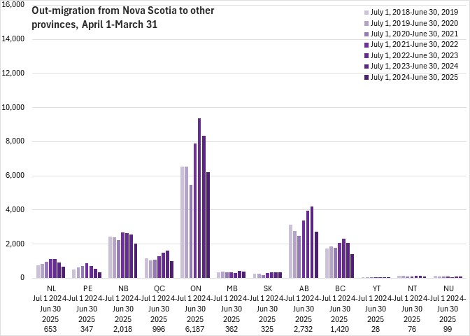 From July 1, 2024 to June 30, 2025, the primary destinations for outmigration from Nova Scotia were Ontario, Alberta and New Brunswick. Compared to the previous year, Nova Scotia out-migration decreased for all of the provinces and territories.