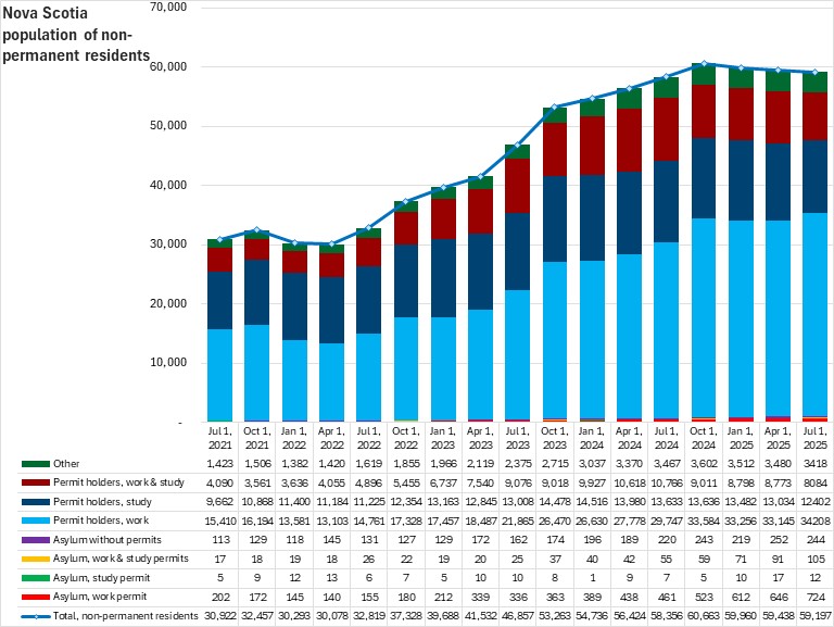 The number of non-permanent residents in Nova Scotia has increased from 30,078 as of April 1, 2022 to 59,197 as of July 1, 2025. Non-permanent residents most often hold work permits (34,208), study permits (12,402), or both work and study permits (8,084).