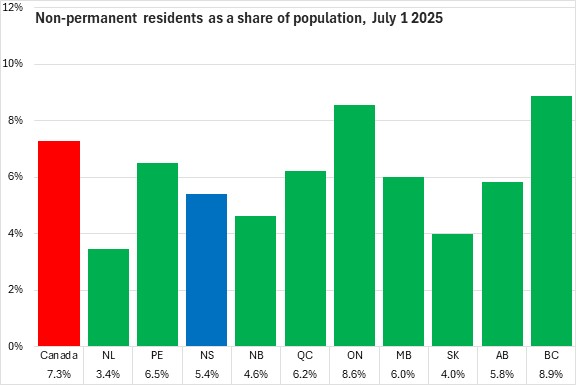 Non-permanent residents accounted for 5.4% of Nova Scotia's population as of July 1, 2025. Nationally, non-permanent residents make up 7.3% of the population with the highest shares in British Columbia (8.9%) and Ontario (8.6%) and lowest shares in Newfoundland and Labrador (3.4%) and Saskatchewan (4.0%).