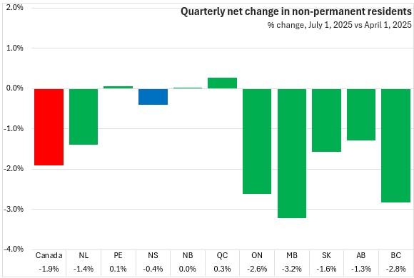 For the period April 1 to June 30, 2025 the non-permanent resident population in Nova Scotia fell 0.4%. Nationally, the non-permanent resident population was down 1.9% with declines in seven provinces. Manitoba, British Columbia, and Ontario reported the steepest declines in non-permanent residents. Québec reported the fastest gain.