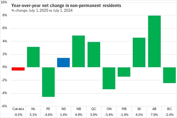 The non-permanent resident population in Nova Scotia grew 1.4% from July 1, 2024 to June 30, 2025. Nationally, the non-permanent resident population decreased 0.5% with notably faster growth in Alberta. Prince Edward Island (-4.6%) reported the steepest year-over-year decline in non-permanent residents.