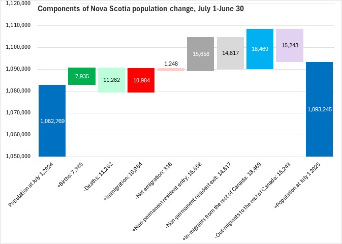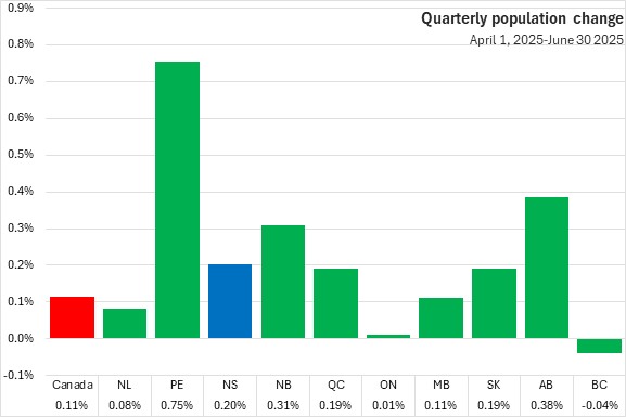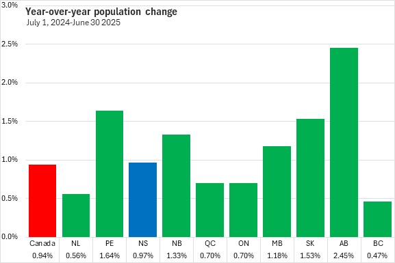 Nova Scotia's population increased by 0.97% (10,476) from July 1, 2024 to June 30, 2025. Nationally, the population grew by 0.94% in the last year, with growth in all provinces. Alberta reported the fastest growth while the slowest growth was in British Columbia.