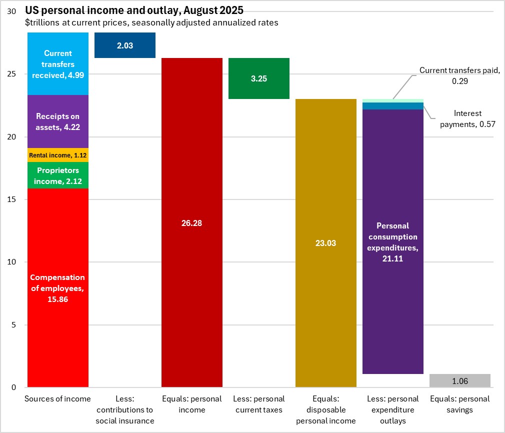 US Bureau of Economic Analysis. Press release, August 2025; Data retrieved Federal Bank of St Louis, Table 2.6. Personal Income and Its Disposition, Monthly NIPA
