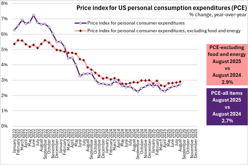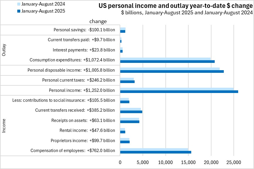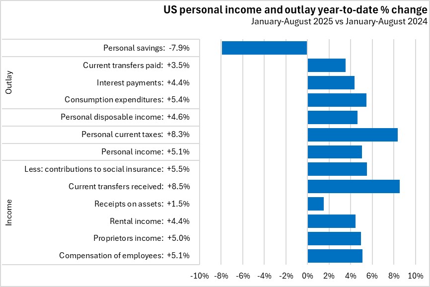 In the first eight months 2025, US personal income increased by 5.1% from the same period in 2024. There were gains from all income sources led by growth in current transfers received (+8.5%). Personal consumption expenditures grew by 5.4%. Personal savings declined 7.9%.