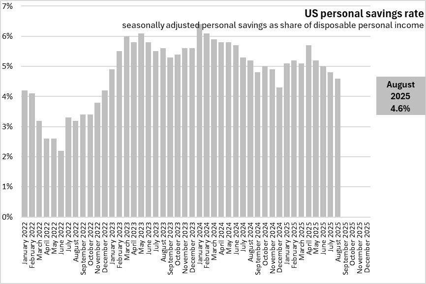 With similar growth rates for personal income and personal consumption the US personal savings rate remained steady at 4.6% of disposable personal income in August 2025.