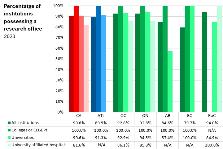 In Canada, 90.6% of all post-secondary institutions had formal research offices, with 100% of colleges/CEGEPs, 90.6% of universities, and 81.6% of university hospitals having a dedicated research office. Atlantic Canadian universities were more likely to have a research office than the national average, but lagged the national average on research offices in university hospitals (data suppressed). University research offices were most common in British Columbia, while the Rest of Canada (RoC) led in research offices in university hospitals. All colleges/CEGEPs reporting had a research office.