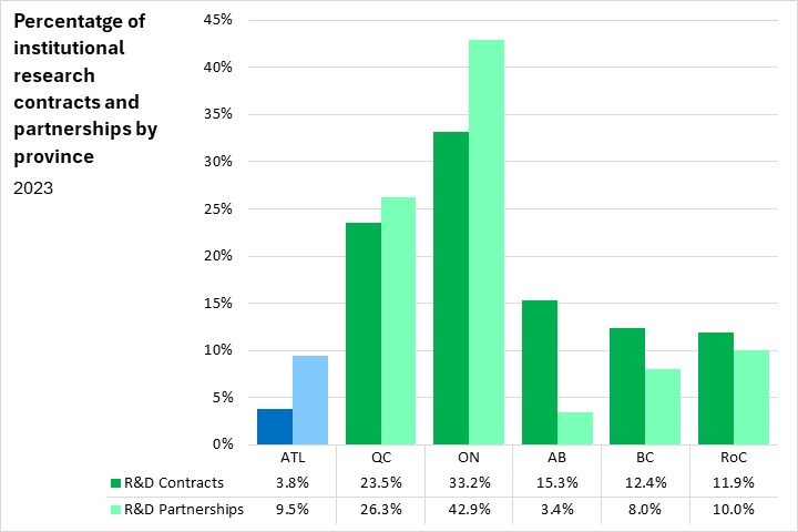 Across Canada in 2023, there were 49,431 R&D partnerships and 66,379 R&D contracts. Post-secondary institutions in Atlantic Canada had almost twice as many R&D partnerships (4,689) in 2023 as R&D contracts (2,500). Ontario had the largest share of Canadian research contracts (33.2%) and partnerships (42.9%). In eastern Canada it was more common for institutions to engage in R&D partnerships, while in Alberta, British Columbia and the rest of Canada it was more common for institutions to engage in R&D contracts.