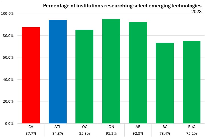 Among select emerging technologies, research was concentrated in Ontario, Alberta and Atlantic institutions, while British Columbia and the rest of Canada had notably lower proportions of institutions conducting emerging technology research. Artificial intelligence research was concentrated in Ontario, while Atlantic Canada had the highest concentration of institutions conducting research in internet integration systems, biotechnologies, geomatics/geospatial technology, nanotechnology and quantum computing. Institutions researching blockchain technologies were most common in Alberta.