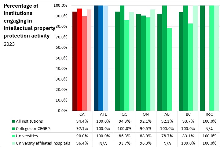 Institutions may engage in activities related to protecting the intellectual property they produce, such as filing patent applications, registering copyright protections, or utilizing resources such as Canadian intellectual property offices or foreign intellectual property offices. In Atlantic Canada and the Rest of Canada, all institutions responding to the survey reported engaging in at least one activity to protect their intellectual property. Ontario and Alberta had the lowest rates of intellectual property protection activity