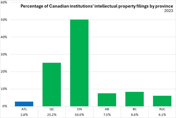 Across Canada there were 2,510 intellectual property filings by Canadian institutions. Half of these were from Ontario institutions, with Québec institutions being the second-most common source of intellectual property filings with 25.2%. Fewer institutional intellectual property filings came from Atlantic Canadian institutions than any other province or region with 2.8% of the national total.