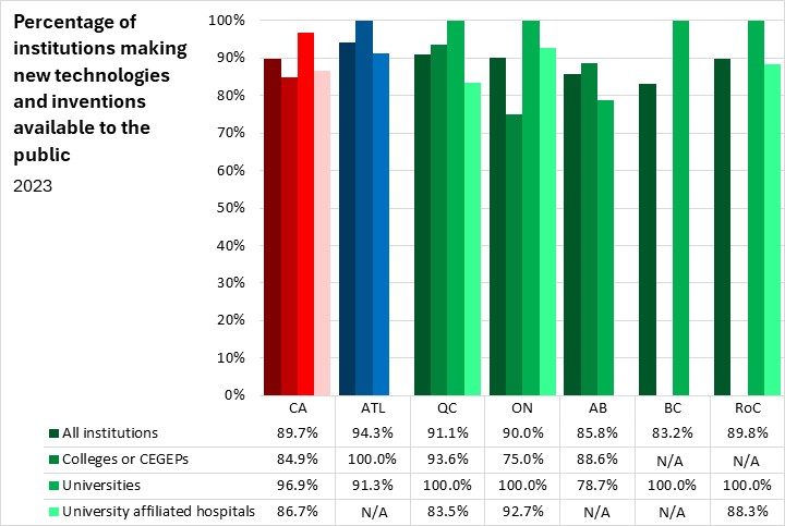 Post-secondary institutions may make their technologies or inventions available to the public in a variety of ways, such as publishing their findings in academic journals, presenting research at conferences and webinars, or publicizing their work in traditional media. Atlantic Canadian Colleges/CEGEPs were more likely than the Canadian average to publicize their findings, with 100% of Colleges/CEGEPs using at least one method to publish their work. In contrast, only Atlantic Canadian and Alberta universities had less than 100% of institutions engaged in making new technologies and inventions available to the public. Ontario university hospitals were the most likely to make new technologies and inventions available to the public.