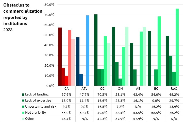 New technologies, inventions or processes may be commercialized by institutions by issuing commercial licenses to use their intellectual property. The most commonly reported obstacle to post-secondary institutions commercializing their findings was a lack of funding, followed by "not an institutional priority". This challenge was most acute in Québec where 70.5% of post-secondary institutions reported a lack of funding as an obstacle to commercialization, above the Canadian average of 57.6%. Institutions in Atlantic Canada, British Columbia, and the Rest of Canada were the most likely to report that commercialization was not an institutional priority.