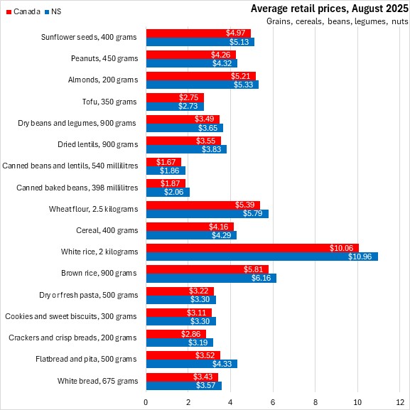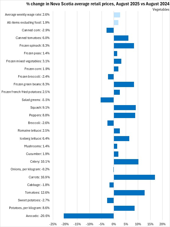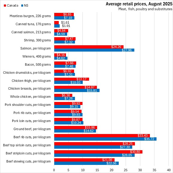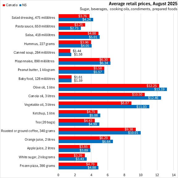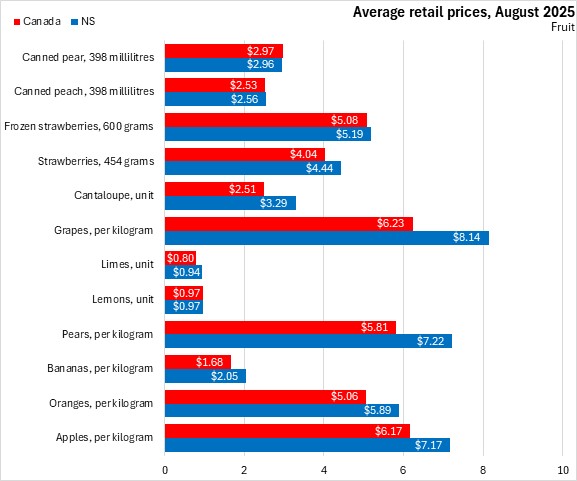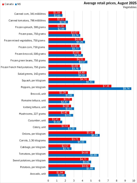 Nova Scotia food prices were more than 10% higher than the national averages for the following products: whole chicken, wieners, salmon, canned tuna, cream, eggs, apples, oranges, bananas, pears, limes, grapes, cantaloupe, potatoes, tomatoes, carrots, onions, , celery, cucumber, mushrooms, iceberg lettuce, broccoli, peppers, squash, flatbread, crackers, tea, cooking oils (vegetable, canola), canned baked beans, canned tomatoes, canned beans, salad dressing