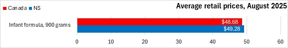Nova Scotia food prices were below national averages for the following products: beef (striploin, top sirloin, ground), pork shoulder, chicken thigh, bacon, shrimp, canned salmon, milk (2 litres), romaine lettuce, baby food, peanut butter, canned pear, tofu, pasta sauce, deodorant