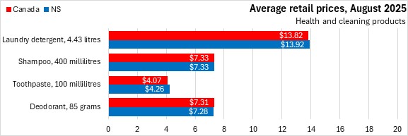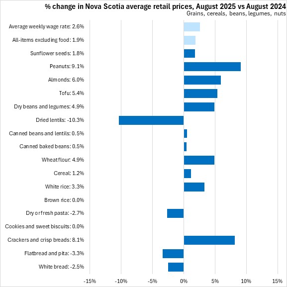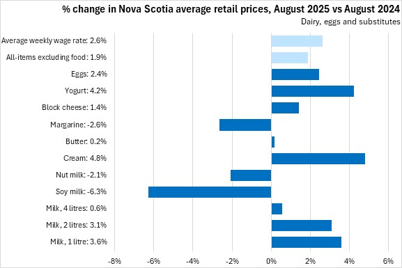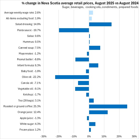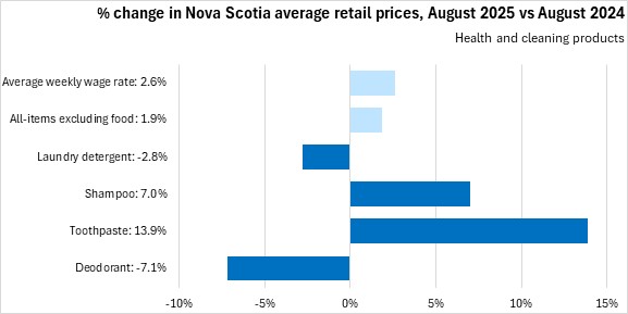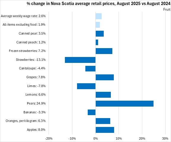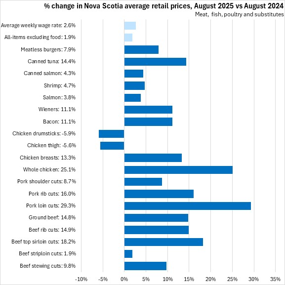Over the last year (August 2025 vs August 2024), the consumer price index for all items in Nova Scotia excluding food increased by 1.9%. Food prices as a whole rose 3.3%. At the same time average weekly earnings across all Nova Scotia industries increased by 2.6%.