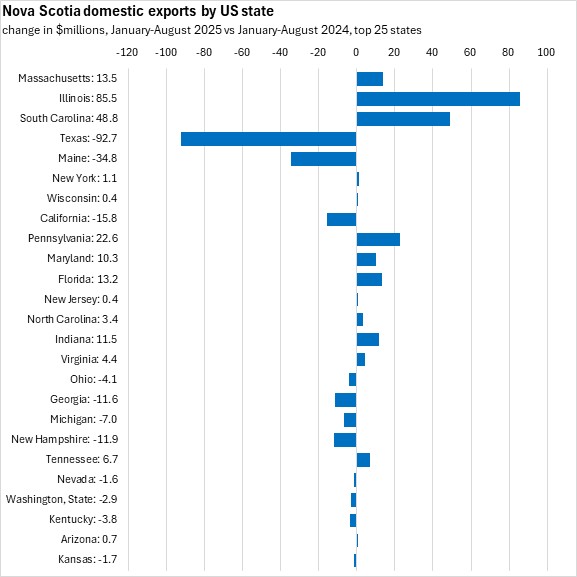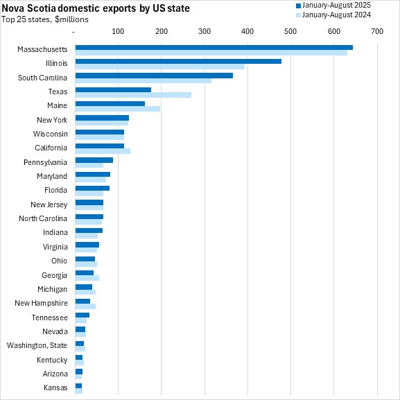 Nova Scotia's exports to the US accounted for 70.3% of exports in January-August 2025. Massachusetts, Illinois and South Carolina each had a larger export value than Nova Scotia's shipments to China in the first eight months of 2025. Exports were up for seven of Nova Scotia's top ten US state destinations; exports were down to Texas, Maine and California. The largest dollar value increases were for Illinois, South Carolina, and Pennsylvania.