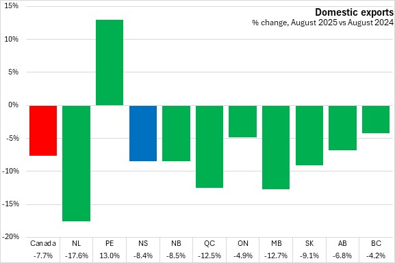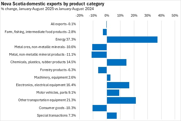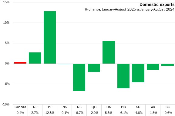 In the first eight months of 2025 domestic exports edged down 0.1% in Nova Scotia compared to the same period in 2024. Canada's exports increased 0.4% for January-August 2025, despite seven provinces reporting declines. Prince Edward Island reported the largest export gain while New Brunswick and Manitoba reported the steepest year-to-date export declines.
