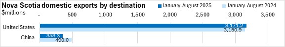 China is Nova Scotia's second largest export destination and exports declined 27.9% to $353.3 million in January-August 2025.