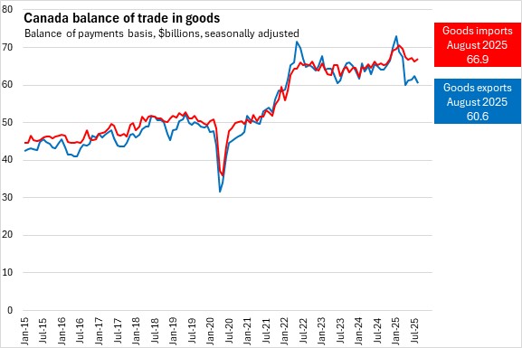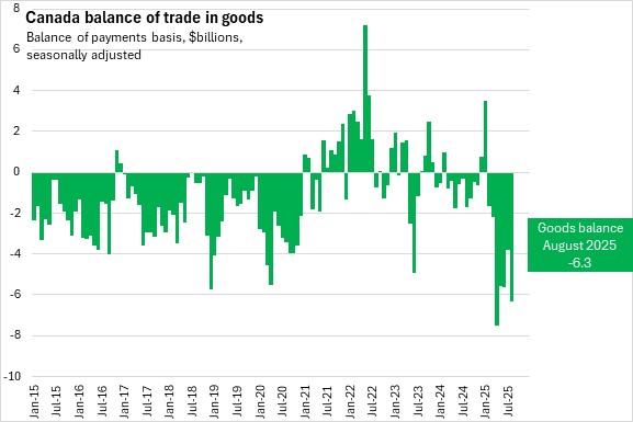 In August 2025, Canada's international exports of goods decreased 3.0% to $60.6 billion. Canada’s goods imports increased 0.9% to $66.9 billion. Canada's trade deficit in goods widened from a revised $3.8 billion in July to $6.3 billion in August.
