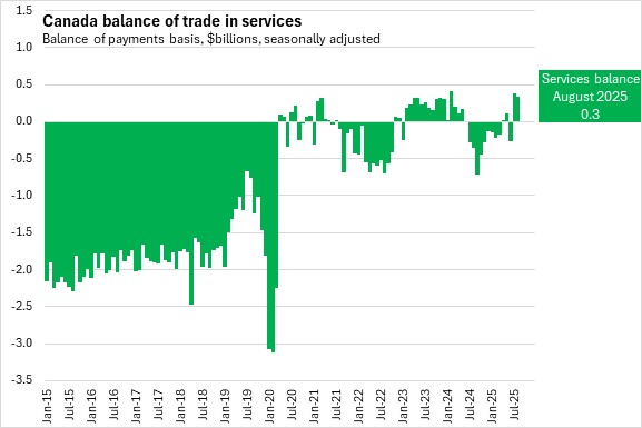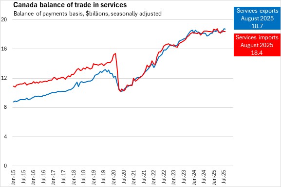 Canada's international exports of services declined 0.2% from the previous month to $18.7 billion in August 2025. Canada's imports of services edged down 0.01% to $18.4 billion. Canada's services trade surplus narrowed by $36 million to $340 million in August.