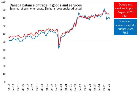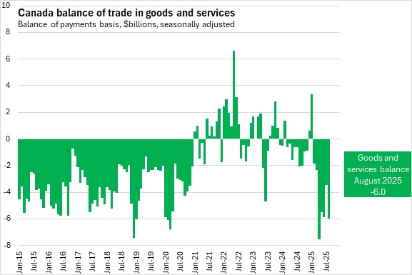 Canada’s international exports of goods and services fell 2.3% to $79.3 billion in August 2025. Canada's international imports of goods and services increased 0.7% to $85.3 billion. Canada's overall international trade deficit widened by $2.5 billion to $6.0 billion in August 2025.