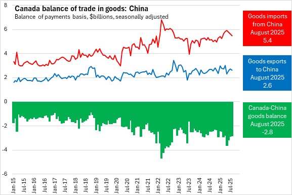 Canada's exports of goods to China decreased 4.3% to $2.6 billion in August 2025. Canada's imports of goods from China fell 3.0% to $5.4 billion. Canada's deficit in goods trade with China narrowed by $53.4 million to $2.8 billion.