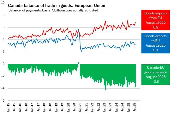 In August 2025, Canada's exports of goods to the European Union fell 4.5% to $3.1 billion. Canada's imports of goods from the EU rose 9.3% to $6.9 billion. Canada's deficit in goods trade with the EU widened by $736.4 million to $3.8 billion.