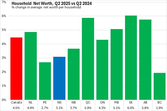 Nova Scotia's net worth increased by 3.1% from Q2 2024 to Q2 2025, slower than the national average (+4.5%). All provinces reported gains over the same quarter the previous year. Québec, Saskatchewan and Alberta reported the fastest gains in net worth. British Columbia reported the slowest gain.