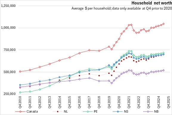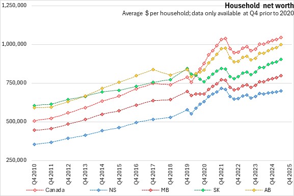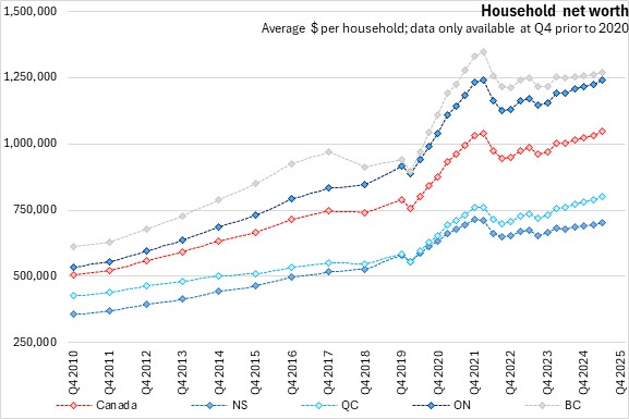Nova Scotia’s real estate asset values declined by $3,925 per household from Q2 2024 to Q2 2025. Nationally, average real estate assets per household fell by $5,305 per household with declines in all provinces, except Québec, led by British Columbia.
