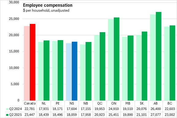 Nova Scotia's employee compensation $18,059 per household, amounting to 77.0% of the national average per household ($23,447) in Q2 2025. Alberta reported the highest employee compensation per household and New Brunswick the lowest (followed by the other Atlantic Provinces).