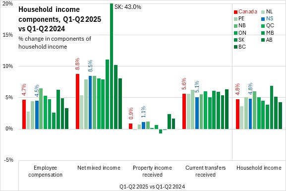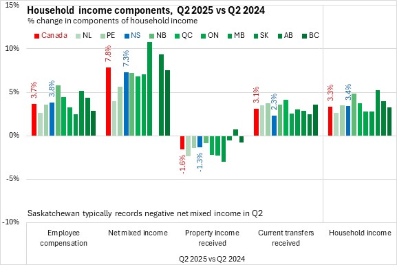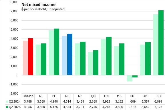 Nova Scotia's net mixed income generated by unincorporated businesses amounted to $4,574 per household, which was 112.8% of the national average per household of $4,056. Across Canada, the highest values of net mixed income per household were in British Columbia. Saskatchewan reported negative net mixed income in Q2 2025. Negative net mixed income for Q2 has been reported in each of the last 4 years in Saskatchewan.