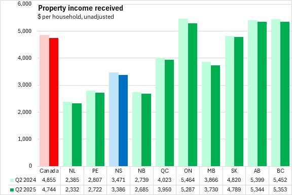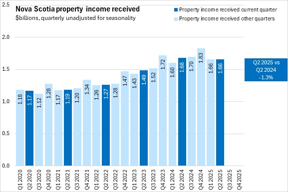 Nova Scotia's property income receipts declined 1.3% while national property income receipts were down 1.6%. All provinces reported except Alberta reported decreases from Q2 2024 to Q2 2025. Manitoba reported the steepest decline in property income receipts.