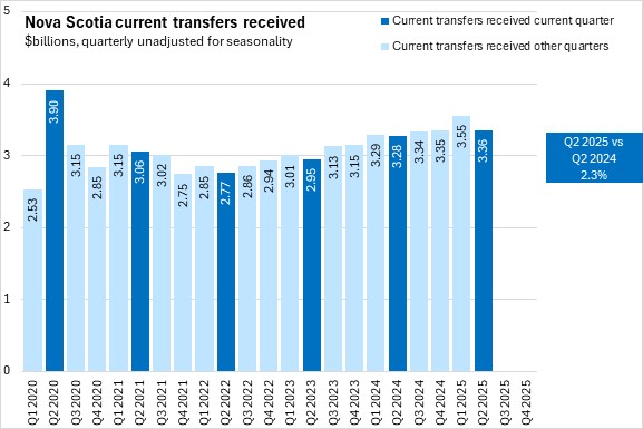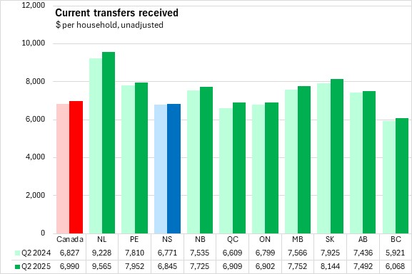 Current transfers received were up 2.3% in Nova Scotia from Q2 2024 to Q2 2025, the slowest rise among provinces. Transfer growth was 3.1% nationally with increases in all provinces (fastest: Québec).