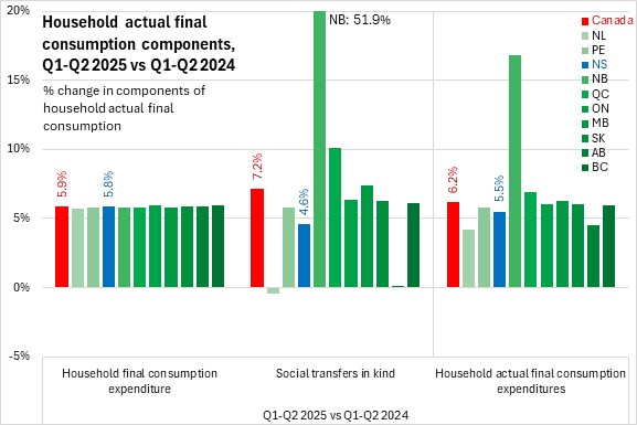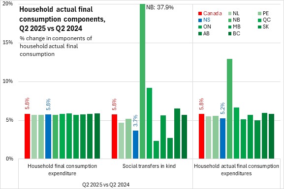The sum of household final consumer expenditures and social transfers in kind is termed 'household actual final consumption expenditures', which reflects the benefits to households from both private expenditures as well as services provided by governments and non-profits. Combining these two components led to year-over-year household actual final consumption growth of 5.2% for Nova Scotia, which was ahead of only Ontario and Manitoba. All provinces reported increasing household actual final consumption expenditures from Q2 2024 to Q2 2025, with New Brunswick reporting markedly faster growth due to 'other' social transfers in kind.