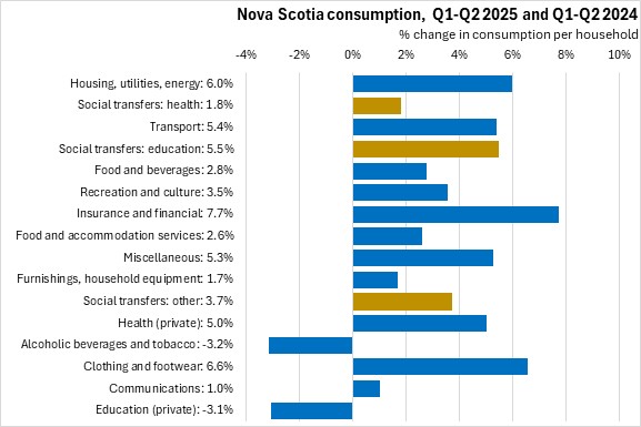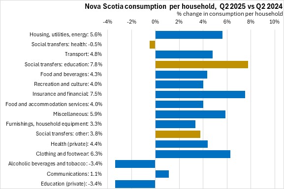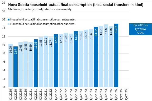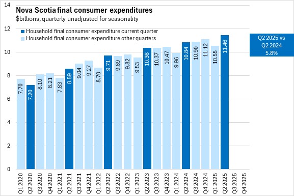 Comparing Q2 2025 with Q2 2024, Nova Scotia's household consumer expenditures increased by 5.8%, the same growth rate as the national pace. Year-over-year growth in consumer expenditures was very similar across all provinces with the fastest gain (British Columbia: 5.9%) barely outpacing the slowest increases (Newfoundland and Labrador, Prince Edward Island, New Brunswick and Manitoba at 5.7% each).