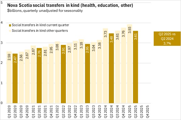 Social transfers in kind refer to services that are provided for the benefit of households but are paid for by governments and non-profits. These are primarily health and education expenditures, which add to private expenditures made on these services. Social transfers in kind increased by 3.7% in Nova Scotia from Q2 2024 to Q2 2025, ahead of growth in only Ontario and Saskatchewan. Social transfers in kind were up in every province with New Brunswick reporting markedly faster growth of social transfers in kind (primarily in the 'other' category outside of health and education). Nationally, social transfers in kind rose 5.8%.