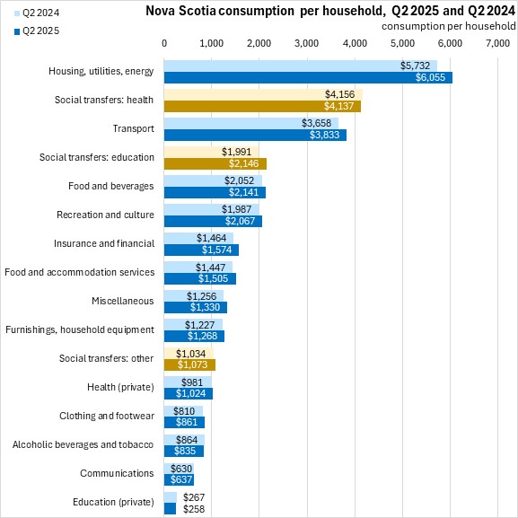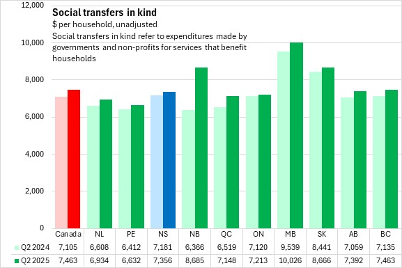 In Q2 2025, Nova Scotian households received $7,356 per household worth of social transfers in kind (98.6% of the national average per household). Across Canada, social transfers in kind were $7,463 per household with the highest value in Manitoba and the lowest value in Prince Edward Island.
