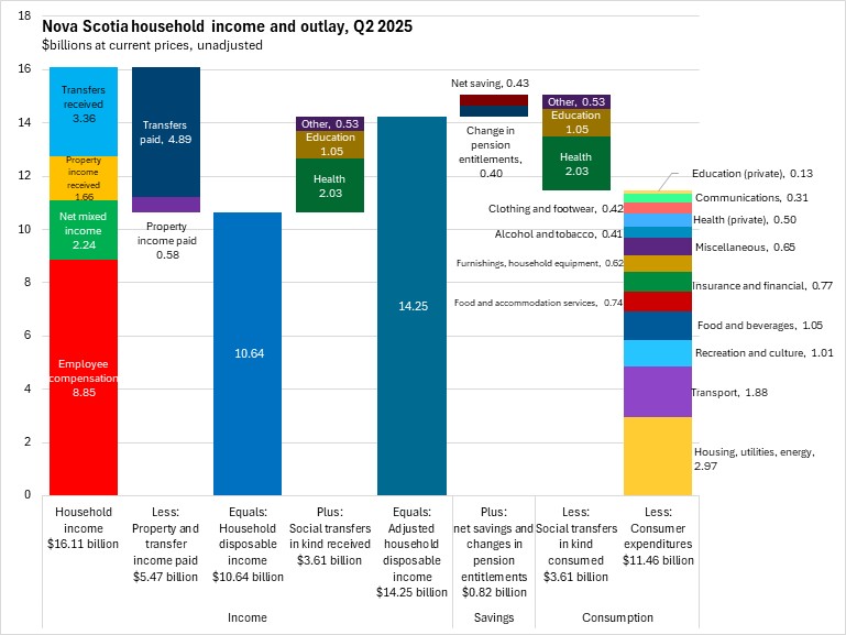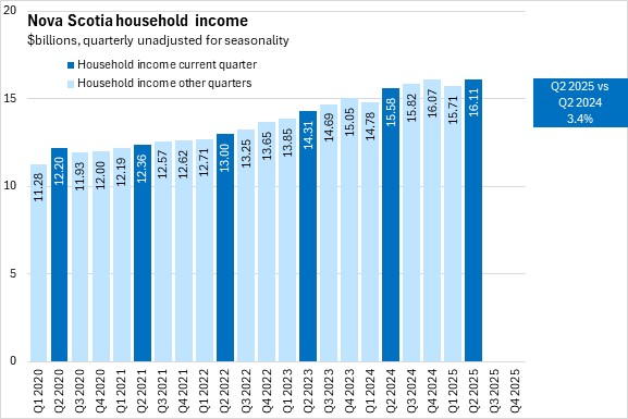 Nova Scotians received $16.11 billion in household income in Q2 2025, including $8.85 billion in employee compensation, $2.24 billion in net mixed income from unincorporated business ownership, $1.66 billion in property income receipts and $3.36 billion in current transfers received.