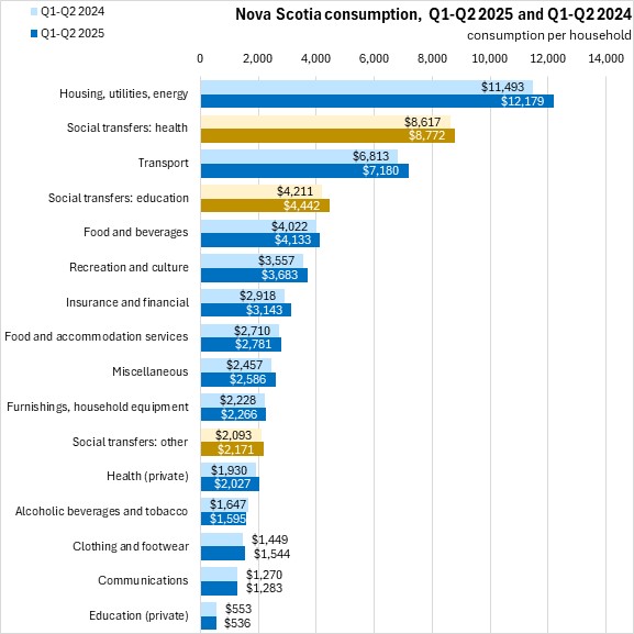 Through the first half of 2025, housing/energy/utilities, social transfers for health and transportation were the largest categories of household expenditure.