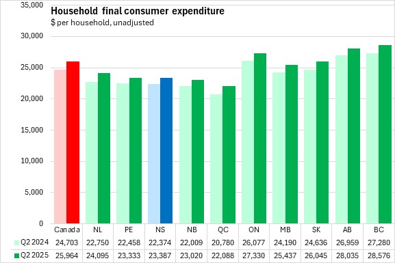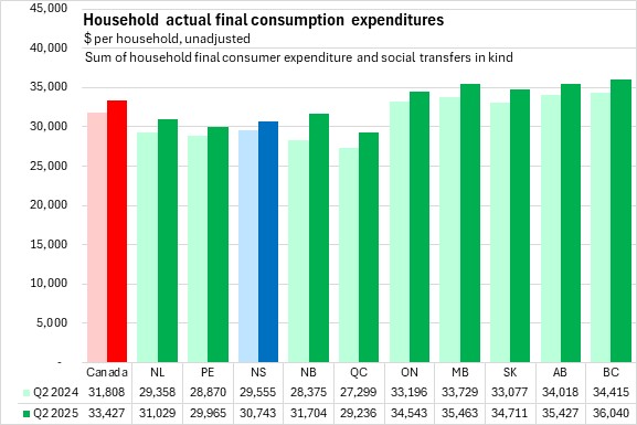 Nova Scotia's household actual final consumption expenditures in Q2 2025 were $30,743 per household (92.0% of the national average per household). National household actual final consumption expenditures were $33,427 per household with the highest value in British Columbia. The lowest household actual final consumption expenditures were in Québec.