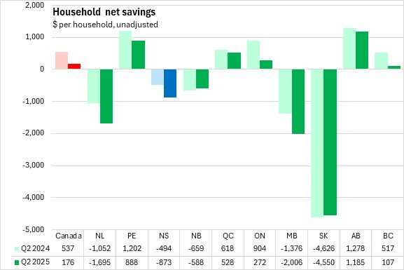 In Q2 2025, Nova Scotia's net savings per household were -$873, deteriorating from the net savings of -$494 per household in Q2 2024. National net savings fell to 176 per household with negative net savings in Newfoundland and Labrador, Nova Scotia, New Brunswick, Manitoba and Saskatchewan. Alberta and Prince Edward Island reported the largest positive net savings. Saskatchewan had the largest negative net savings.