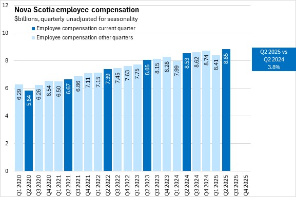 Nova Scotia's rising household income reflected employee compensation growth of 3.8%. Nationally, employee compensation was up 3.7% year-over-year with gains in all provinces. New Brunswick had the fastest year-over-year rise in employee compensation (slowest: Manitoba).